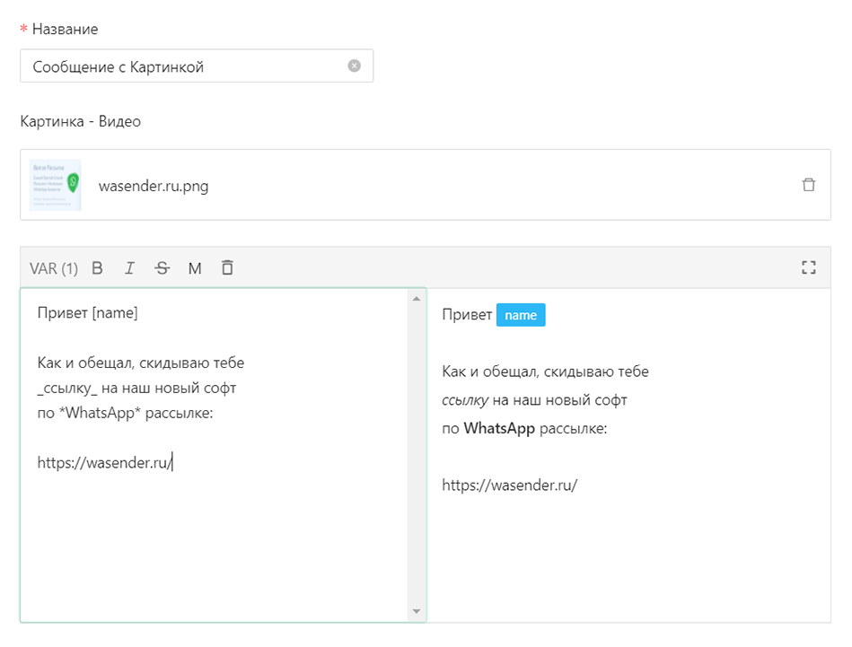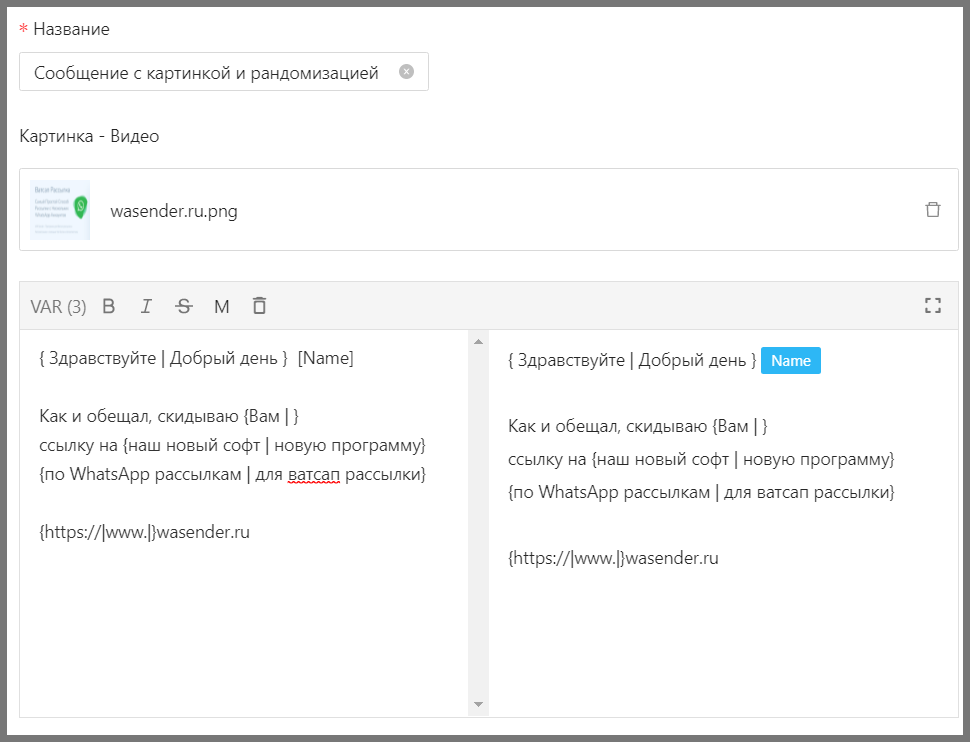 Whats Master поддерживает все популярные типы сообщений. Вы можете одновременно использовать как одно так и несколько сообщений разных типов. Поддерживается рандомизация текста выделение текста и Эмодзи