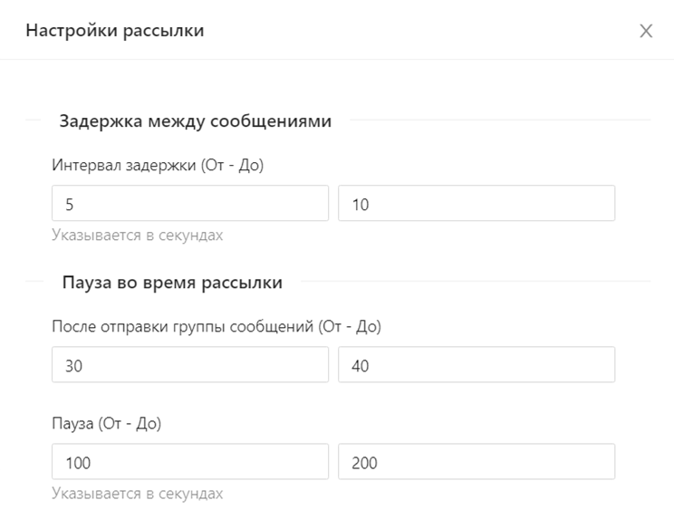 Вы можете настроить случайный интервал между сообщениями и случайную паузу после определенного количества сообщений. Отправлять рассылку можно сразу или запланировать старт в определенное время или с определенным интервалом.