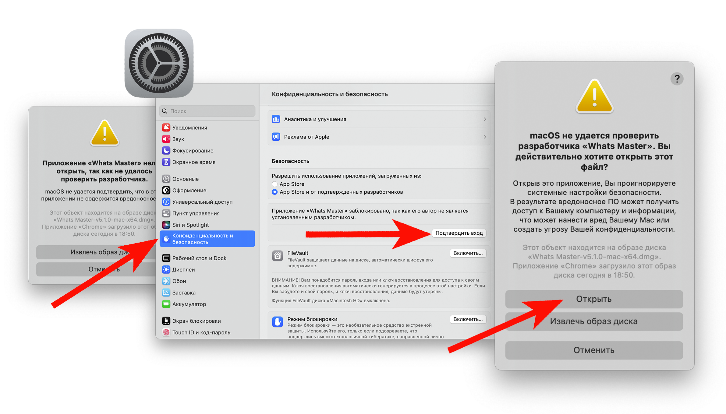 При установке на MAC OS необходимо открыть Системные настройки, открыть раздел Конфиденциальность и безопасность и разрешить установку программы: