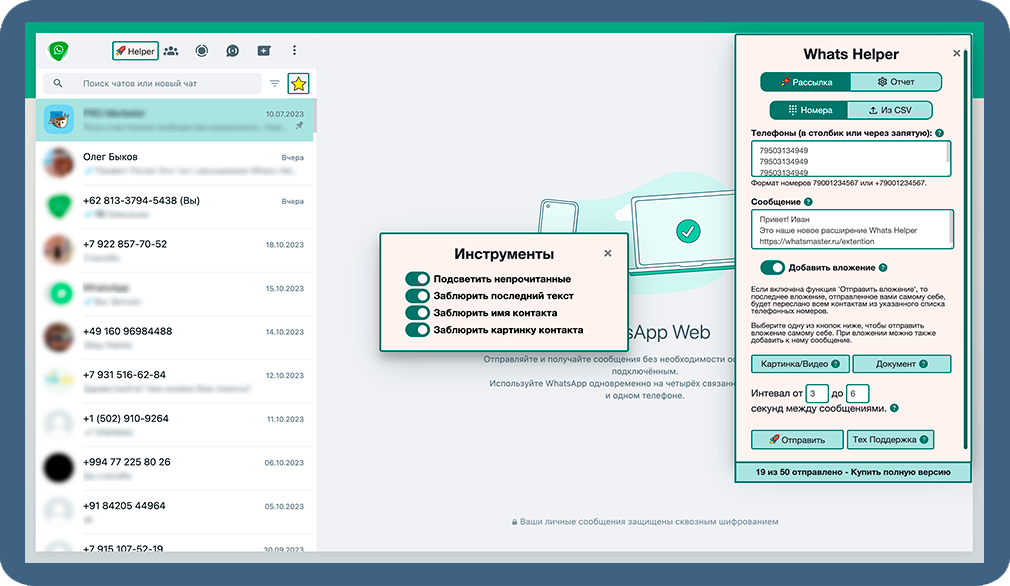 Расширение браузера Google Chrome для Ватсап рассылки через Веб версию Ватсапа.