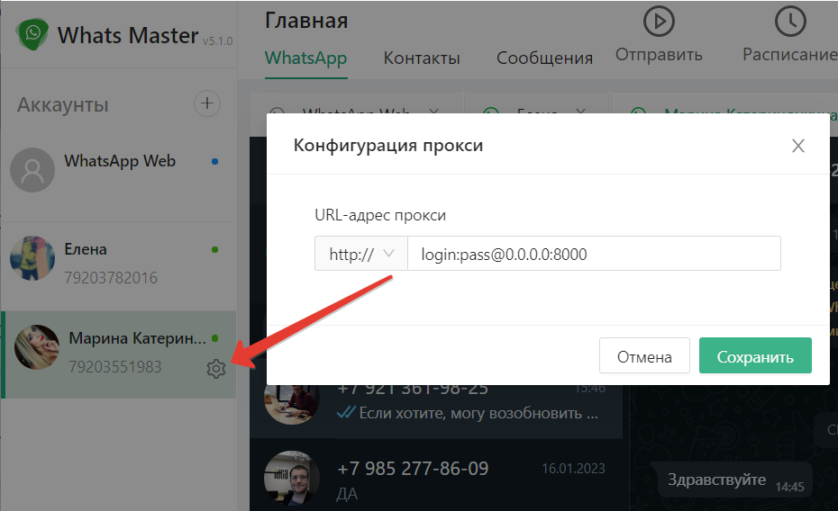 В программе можно подключить прокси индивидуально для каждого WA аккаунта, наведя на значек шестеренки.